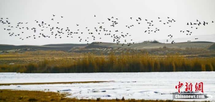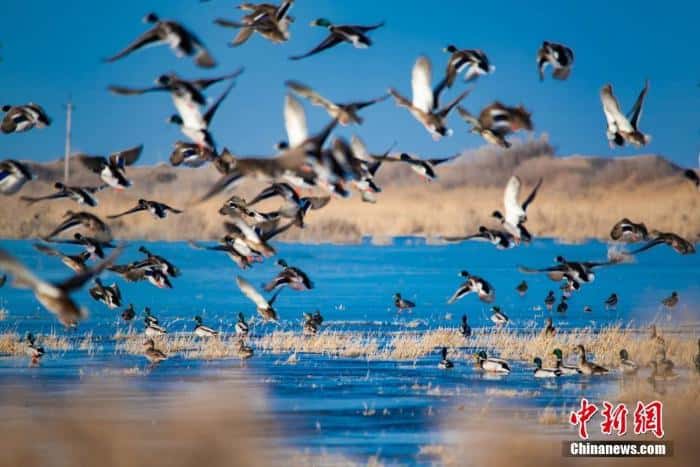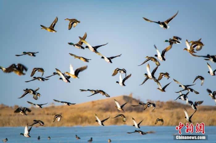 图为甘肃敦煌阳关国家级自然保护区渥洼池内百鸟飞翔 王斌银摄