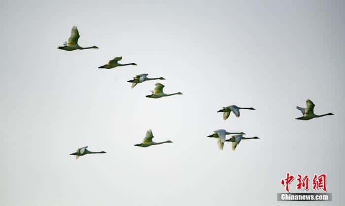 图为甘肃敦煌阳关国家级自然保护区渥洼池内一群白天鹅正在飞翔 王斌银摄