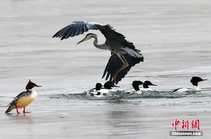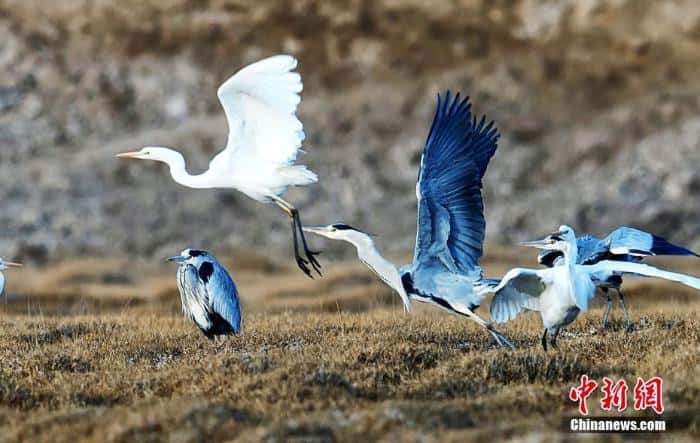 苍鹭在湿地边与其他鸟类嬉戏 祝桂福摄