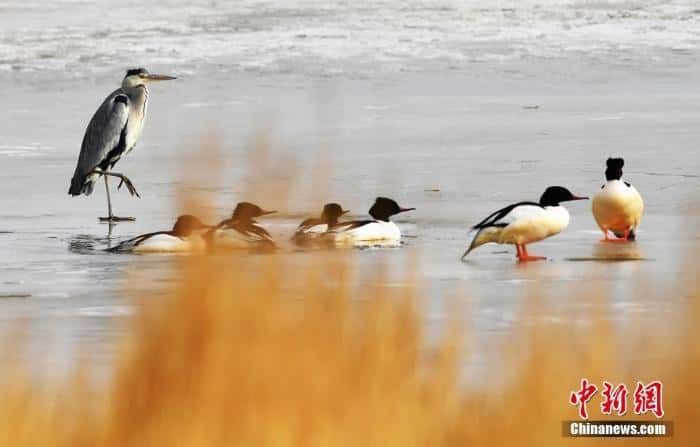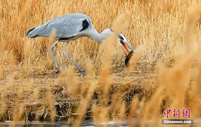 1月9日,在青海省海西州格尔木湿地,摄影爱好者拍摄到野生鸟类苍鹭捕食的画面,苍鹭漫步于湿地,一副悠然自得的神态,吸引了拍客们的瞩目 祝桂福摄