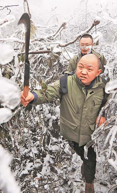 通往二捻坪科学监测站的道路被冰凌封住,两人正用弯刀开路