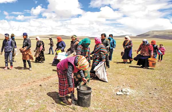 图为玛曲乡群众正在长江源捡拾垃圾 记者 格桑吉美摄