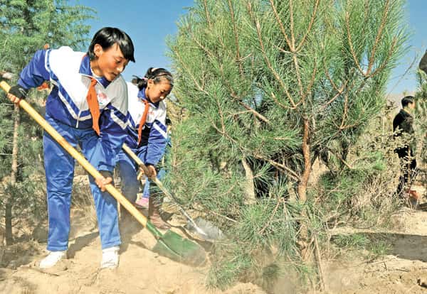 图为来自拉萨市城关区小学的学生们正在栽种小树苗 记者 旦增西旦摄
