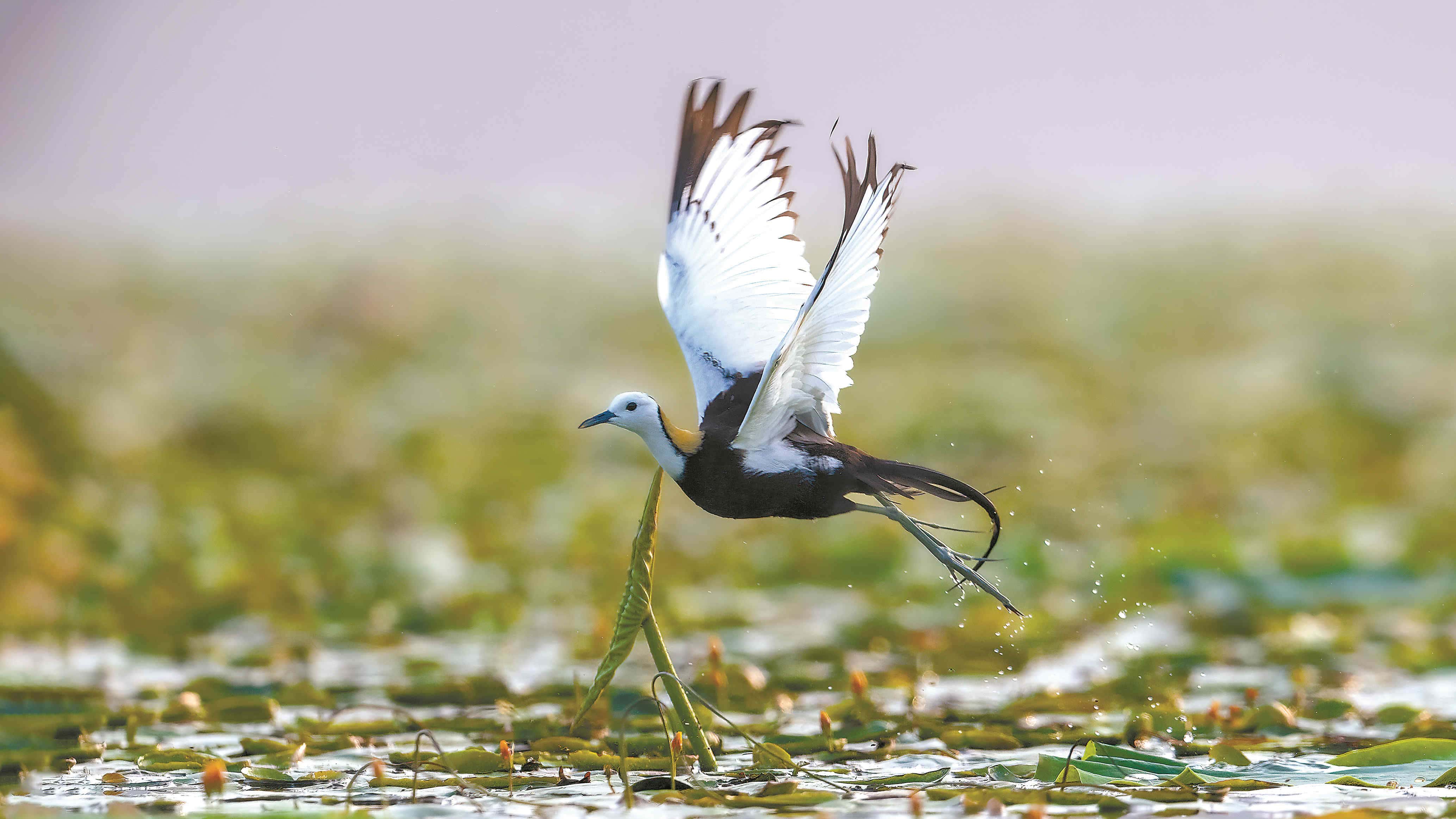 水雉体态优美、色泽艳丽,有“水凤凰”“凌波仙子”之美称,是少见的一妻多夫制,雌鸟产卵后便潇洒离去,雄鸟则一心一意地孵蛋并把小鸟带大,然后一起飞往南方越冬