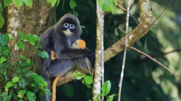 在距离云南省德宏州芒市城区十几公里外的林区,有这么一群可爱的“精灵”,它们身披灰色毛发,黑珍珠般闪亮的双眼周边“涂”着淡蓝色的眼影,拖着长长的尾巴,时而穿越林冠,时而嬉戏溪谷