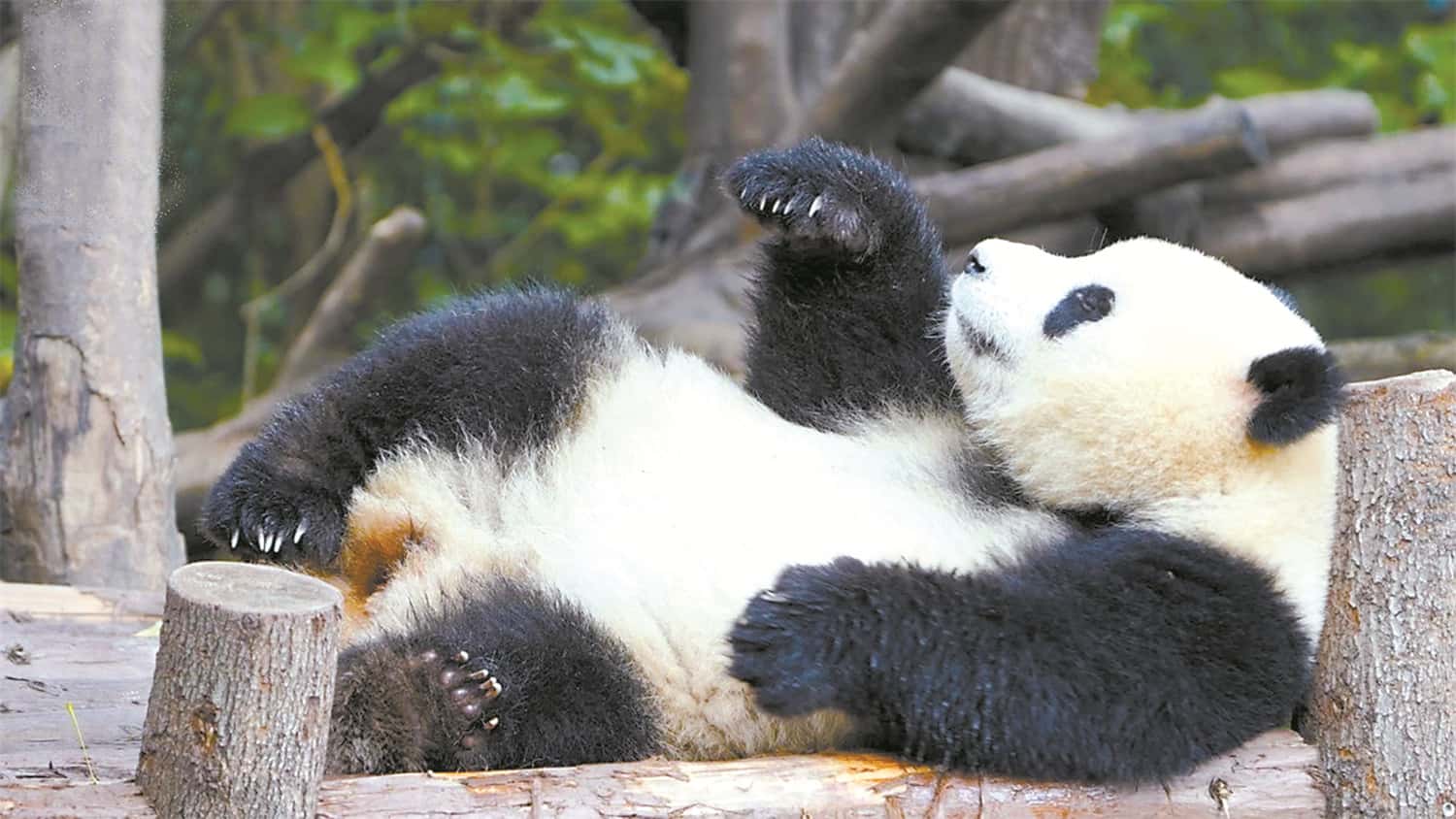 大熊猫的卧睡姿势很有意思,无论在栖架上、睡床上,还是在树杈上,四肢都会自然下垂,有一种松弛感。
