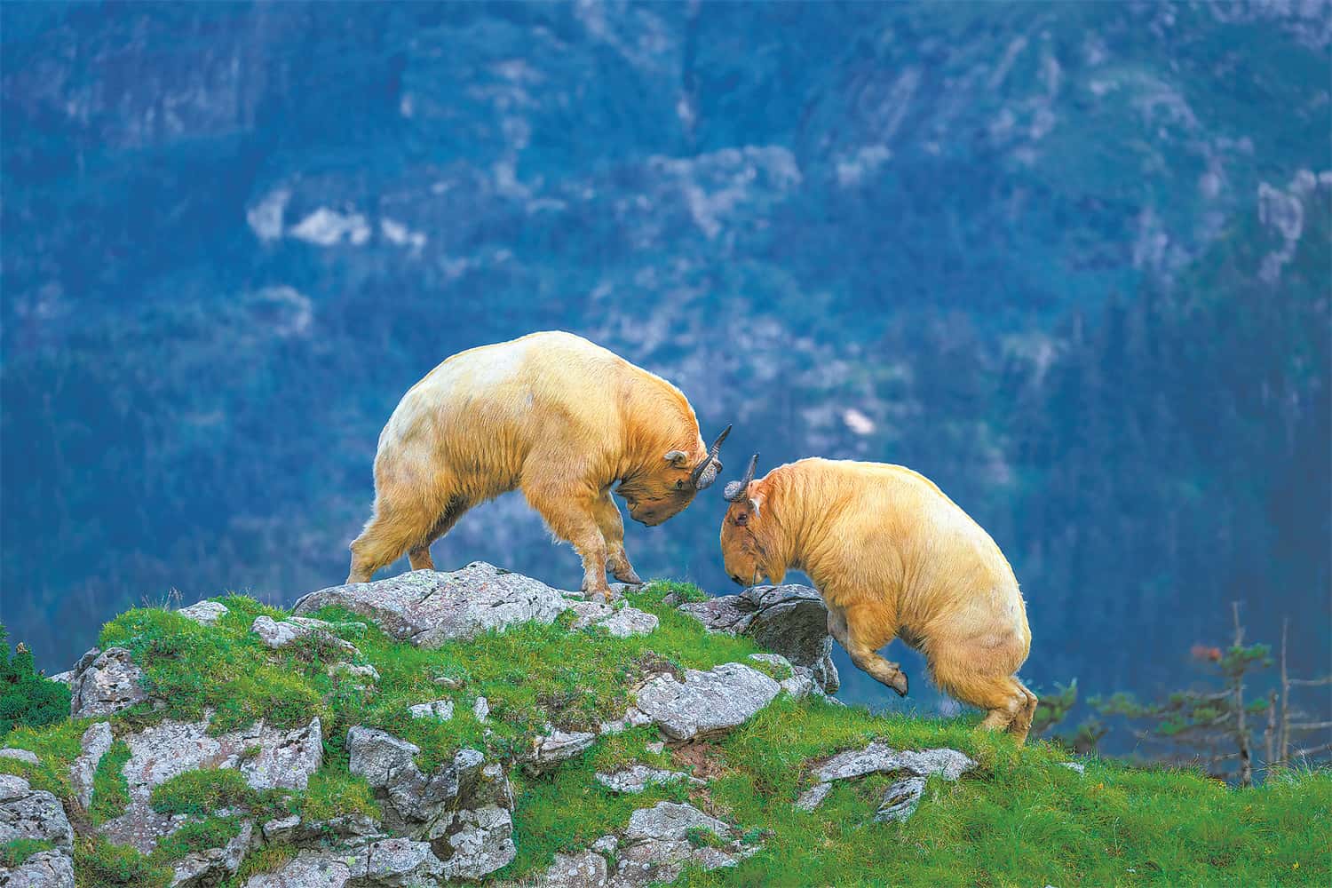 秦岭羚牛,又被称为“秦岭金毛扭角羚”,当地人也叫它“白羊”,体型硕大,是一种大型食草动物,也是秦岭当之无愧的“霸主”。它头如马、角似鹿、蹄如牛、尾似驴,所以也称“四不像”。每年六七月份,秦岭羚牛聚集在高山之巅,为爱决斗、繁衍生息。它们聚群少则十几头,多则几十头乃至上百头,蔚为壮观。目前,保守估计秦岭羚牛数量约5000—8000头。