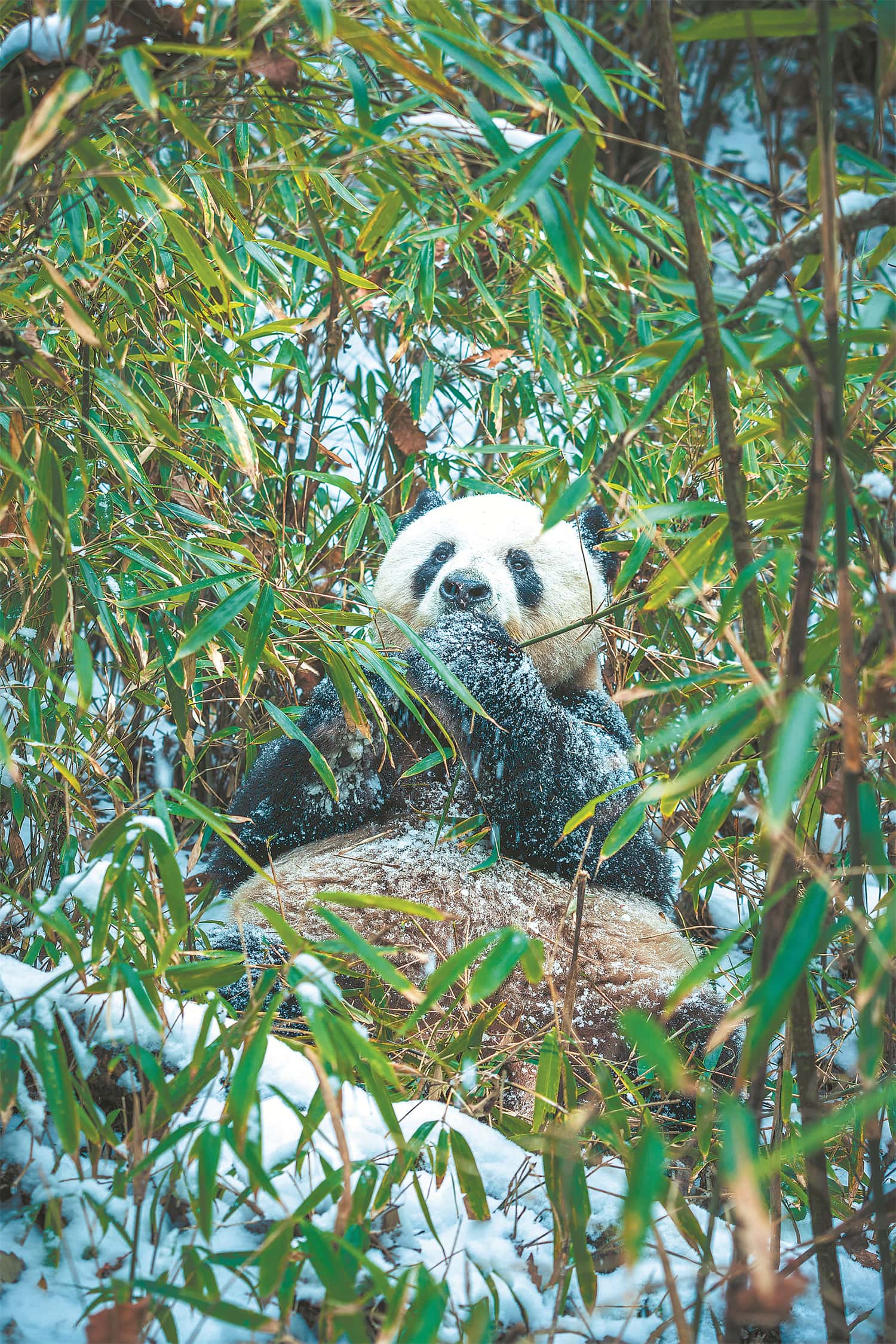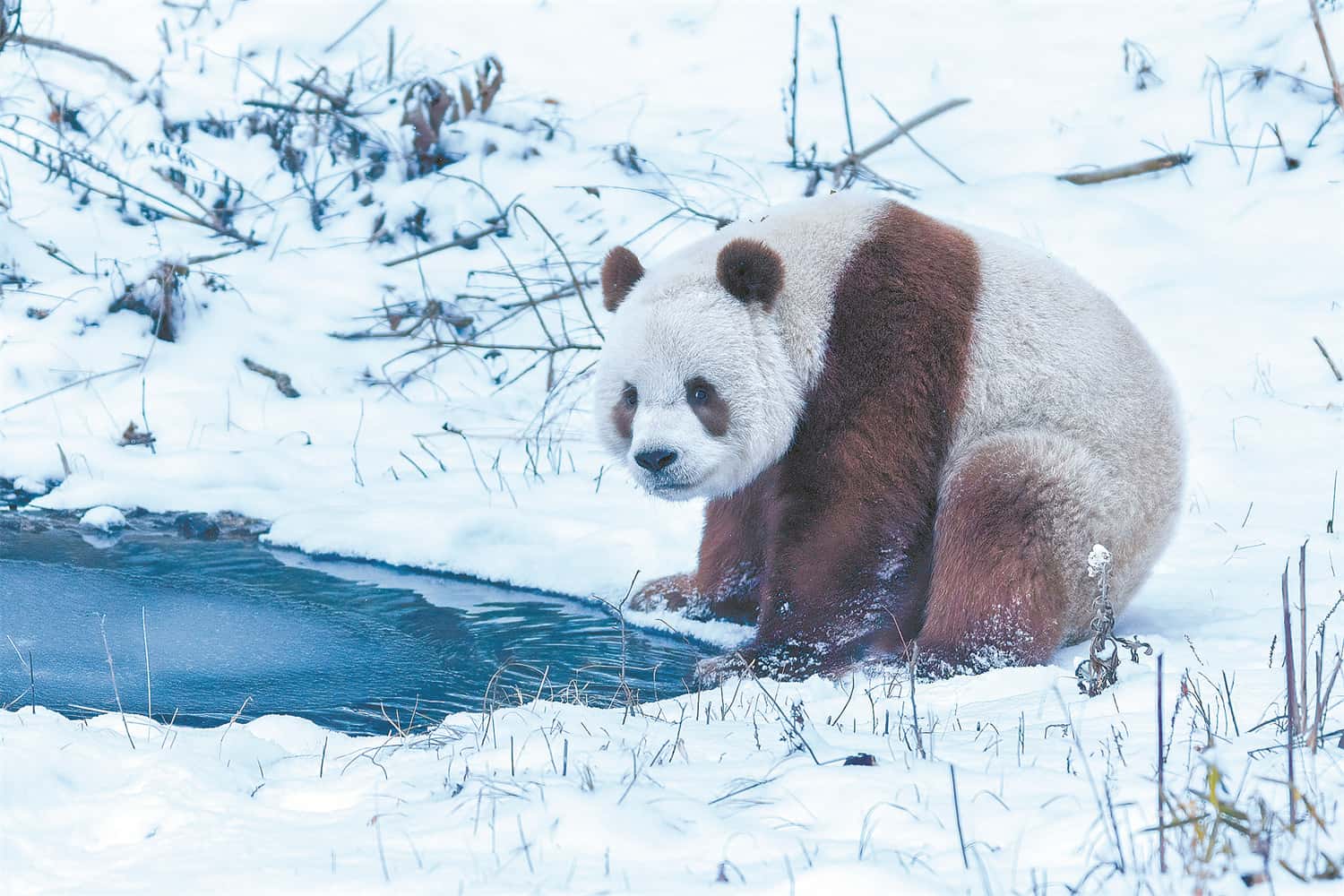罕见的棕白色大熊猫“七仔”雪地喝水