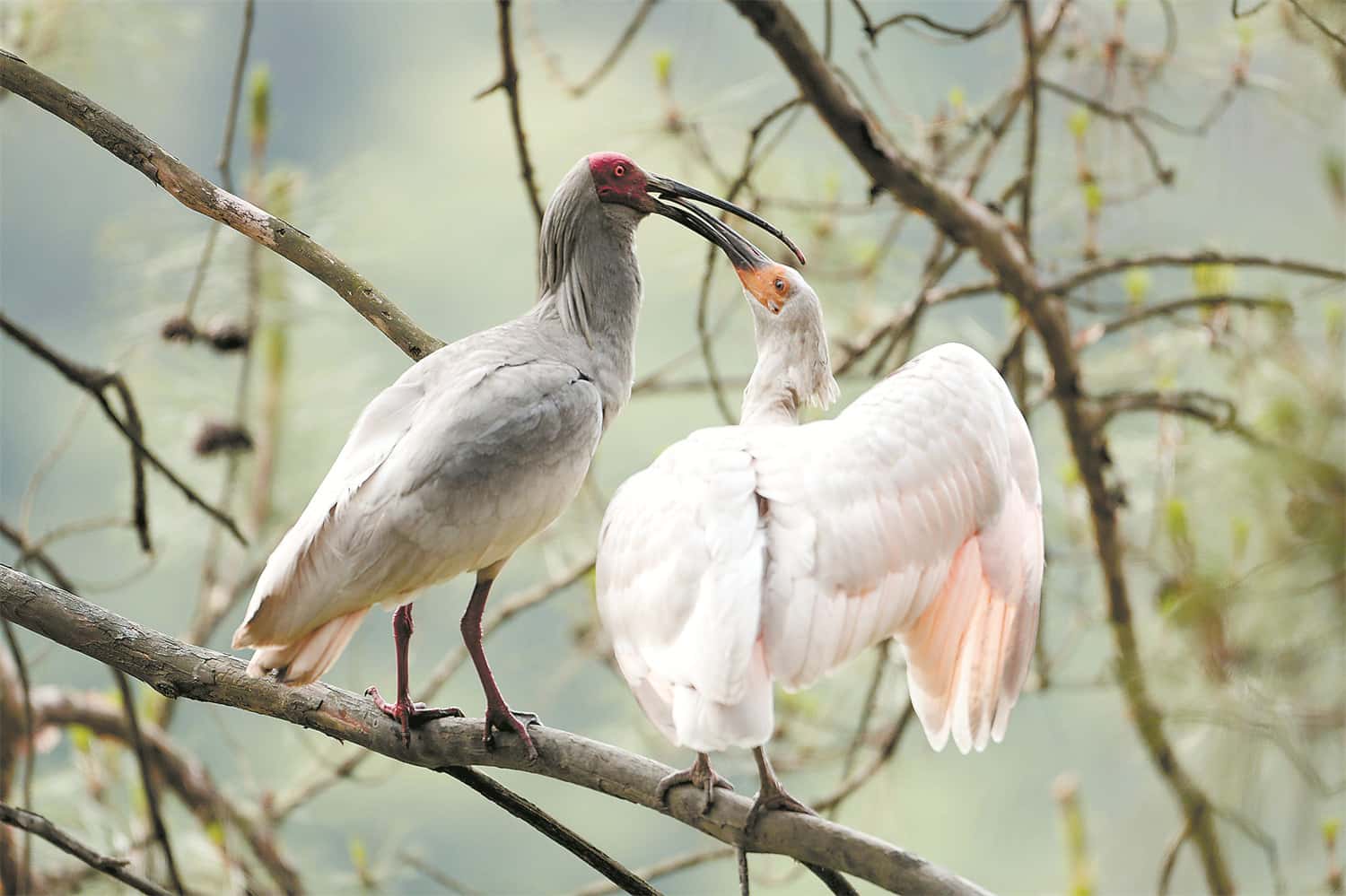 朱鹮,古称朱鹭、红朱鹭,系东亚特有种,唐代诗人张籍在游终南山时目睹朱鹮身姿后一见倾心,在《朱鹭曲》中记录下了朱鹮的美妙身姿,“翩翩兮朱鹭,来泛春塘栖绿树。羽毛如翦色如染,远飞欲下双翅敛。”但如此漂亮的鸟儿却曾在20世纪一度销声匿迹。1981年,我国专家在陕西洋县重新发现7只野生朱鹮。经过42年不断保护,朱鹮种群数量已从被发现时的7只发展到全球突破万只大关,野生种群栖息地面积由被发现时的不足5平方公里扩大到1.6万平方公里。其受危等级也由极危调整为濒危,栖息地由最初发现时的洋县姚家沟逐步向东亚历史分布地恢复,呈现出种群数量和栖息地面积双增长的良好态势,创造了举世瞩目的生态奇迹。如今,朱鹮早已跨越秦岭,从长江流域扩展至黄河流域。(赵建强)