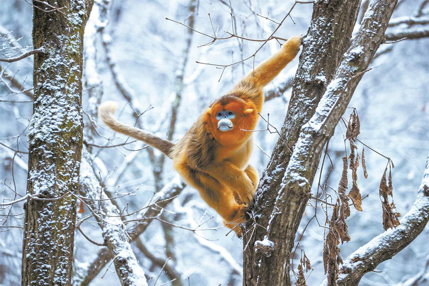 分布在秦岭地区的金丝猴是川金丝猴秦岭亚种。它们鼻孔向上仰,颜面部为蓝色,因此也称仰鼻猴、蓝脸猴,常常活跃在海拔2000—2800米的针阔混交林地带,过着群居生活。金丝猴家族长幼有序、尊老爱幼,寻得野果之类的美味佳肴,必让家长大公猴、幼猴先食,余下的方才分食。若谁敢不遵守猴规,定会受到家法的严惩。在金丝猴的社会中,没有“猴王”之说。它们的家庭是一夫多妻制,也就是一只成年雄猴作为家长和多只雌性生活在一起并繁衍后代,组成一个家庭。多个家庭单元再聚集在一起,共同觅食、活动和休息,组成了一个大的繁殖群。金丝猴这种由单元、分队、群组、社群层层嵌套的独特社会结构,科学家们称为“重层社会”。这种社群结构是为了克服近亲交配、最大限度地获得遗传多样性。
