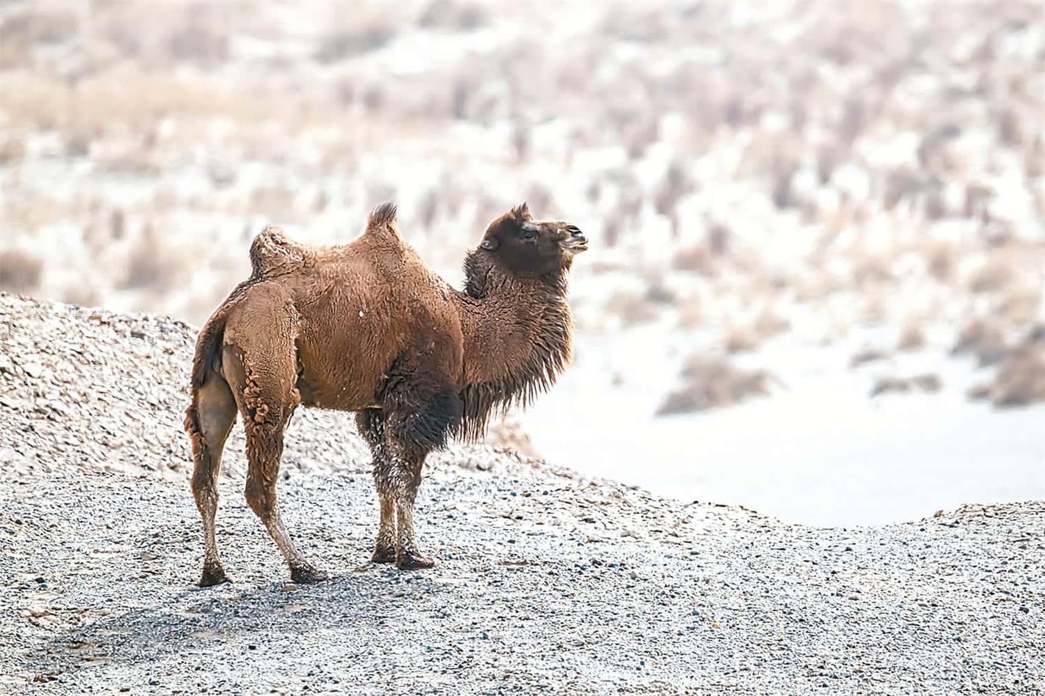 野骆驼是骆驼科骆驼属的一种野生动物,主要分布于气候极端、干旱少雨、环境恶劣的中亚辽阔荒漠和半荒漠地区。其适应力极强,能够在没有水源的情况下生存数天。野骆驼的双峰之间有一个明显的凹陷,耳朵较小,尾巴较短。体型相较于家养骆驼略显小巧,毛色却比家养骆驼略深,通常为浅黄至红褐色。这种色彩在沙漠中起到很好的保护作用,使它们能够与周围环境融为一体、躲避天敌。