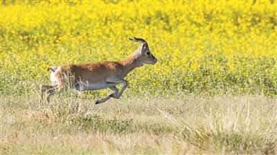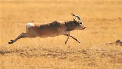 普氏原羚奔跑时像离弦的箭,姿势与众不同,前后肢分别并在一起,后肢用力后蹬,身体跃入空中,着地时用力后撑,这种跳跃式的奔跑使羚羊的身体在空中划出一道波浪起伏的曲线,分外优美。