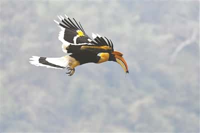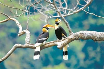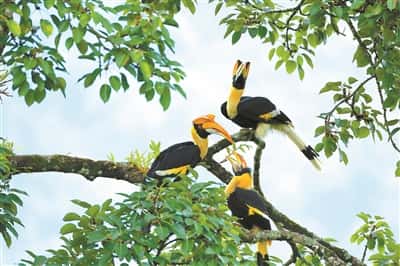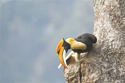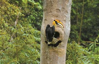 双角犀鸟是一种昼行性动物,平常成群而居,每年的3—6月是双角犀鸟的繁殖期,只有在繁殖期到来时它们才离开大群体,和爱侣双宿双栖。双角犀鸟有“爱情鸟”之称,雌雄犀鸟结对后,遵循“一夫一妻”制,一旦雌性犀鸟受孕,便不再出洞,在洞中孵卵、育雏。为减少猛禽、蛇类等天敌的威胁,新婚燕尔的双角犀鸟夫妻,即便在孵化期间也不会闲着,它们要做的第一件事就是加筑并封闭洞穴,仅留一个“小窗口”让雌鸟嘴端能够伸出接受雄鸟的投喂。
