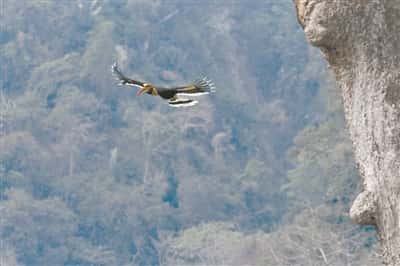双角犀鸟栖息于海拔1500米以下的低山和山脚平原常绿阔叶林,尤其喜欢靠近湍急溪流的林中沟谷地带。它们繁殖期间,成对或雄鸟单独活动,非繁殖季节常会集群翱翔或栖息于雨林大树树冠上。它们以各种热带植物的果实和种子为食,有时也捕食昆虫和爬行类、两栖类等小型动物。巨大的食物需求和超强的飞行能力,使得其在生态系统中扮演着森林种子的传播者。