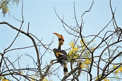 双角犀鸟是热带雨林标志性物种之一,分布于柬埔寨、印度、缅甸、泰国、马来西亚和印度尼西亚等国,在我国分布范围狭窄,仅在云南的西双版纳及德宏有分布,种群数量稀少。目前,位于德宏的云南铜壁关省级自然保护区是我国唯一能稳定监测到双角犀鸟繁殖的地区,而盈江的洪崩河区域则是犀鸟分布最为集中的区域,这里又被称为“中国犀鸟谷”。