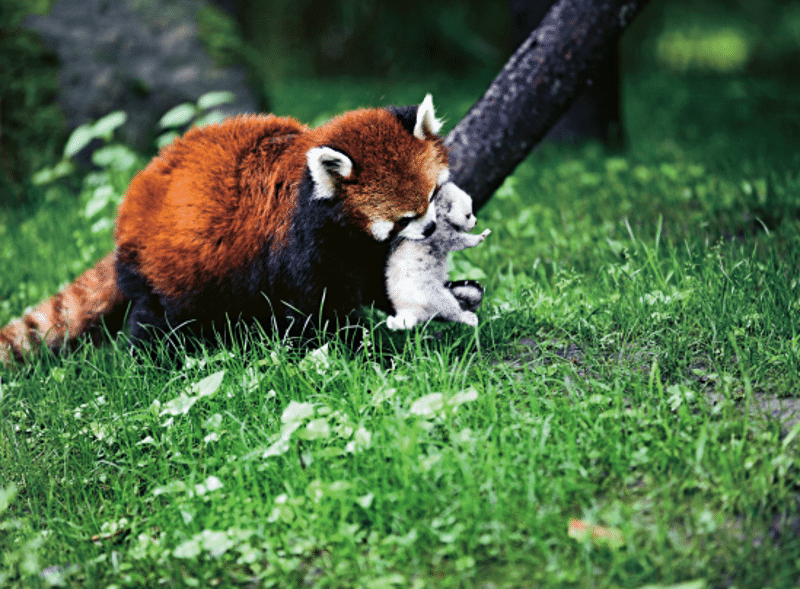 小熊猫全身红褐色,头部有标志性的脸斑,但新生的小熊猫毛色灰黄,头部白色,没有脸斑。出生两个多月后,小熊猫宝宝的毛色才会逐渐与成兽相似。这是四川卧龙国家级自然保护区的小熊猫及其幼崽。(何胜山摄)