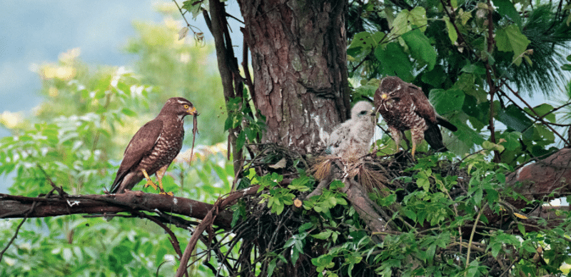 灰脸 鹰的家建在大约15米高的大松树枝杈上。这一刻,一只亲鸟正在给雏鸟喂食(猎物的脏器),另一只亲鸟叼着刚捕获的蜥蜴在旁耐心等候,多么幸福的三口之家。与棕褐色的成鸟不同,灰脸鹰幼鸟是灰白色的。(姚国才摄)