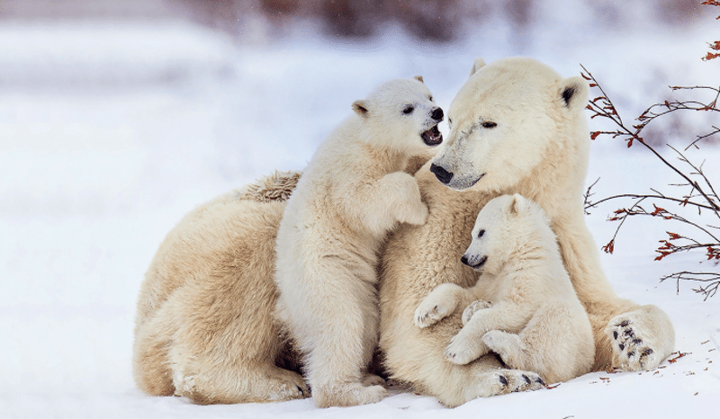 北极熊宝宝依偎在母亲的身旁。两岁之前,幼崽都要跟随母亲学习捕食,并学会如何应对寒冷严酷的环境,之后便离开家庭,独自生活。陈宝婷摄
