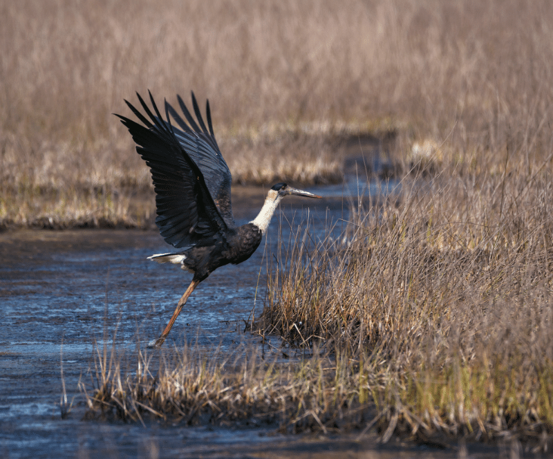 不同于白鹳,白颈鹳十分怕人,常单独或集小群在湿地活动,察觉到危险便立即起飞离去。(视觉中国供图)
