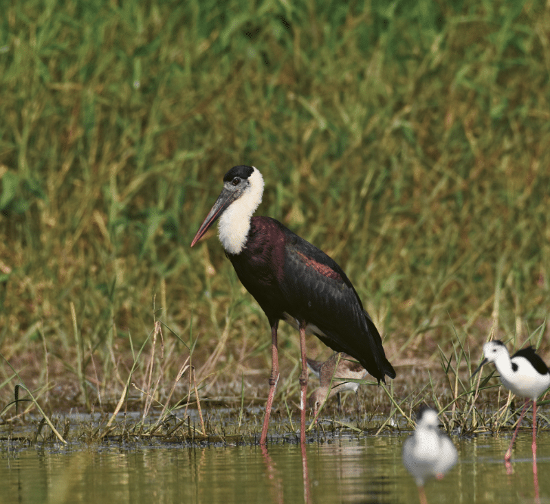 我从双筒望远镜中看见一只黑色大鸟在亮水区东边浅水沼泽活动,附近有3只黑鹳、5只黑颈鹤以及20多只赤麻鸭。通过观察这只大鸟白色的颈部和腹部特征,我怀疑是白颈鹳。但因距离太远,我不能准确看清形态特征,于次日下午又到纳帕海观察,适逢当地著名的生态摄影师彭建生前来拍鸟,我用他的徕卡观察望远镜对这只鸟进行了仔细观察,确认为白颈鹳。当时它与3只黑鹳混群觅食,体型较黑鹳略小,通体蓝黑色,头顶黑色,颈部白色,反差极明显。