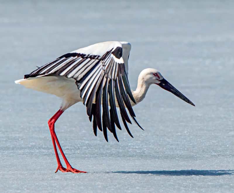 图说2:东方白鹳全身大部分为白色,醒目的黑色飞羽在阳光照耀下会呈现紫铜色的金属光泽。尤其在冬天,这种兼具白红黑三色的大鸟被闪亮的冰面衬托得尤为高贵。(沈福胜摄 鸟网·逐日三省)