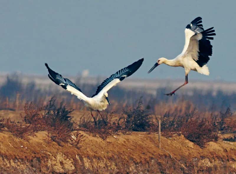 图说3:东方白鹳有时会与同伴嬉戏打斗。通常情况是一只离开地面,扇起翅膀,用喙和腿做出攻击的姿势,而另一只则偏头躲避,用双翅抵挡或主动回击。(视觉中国供图)