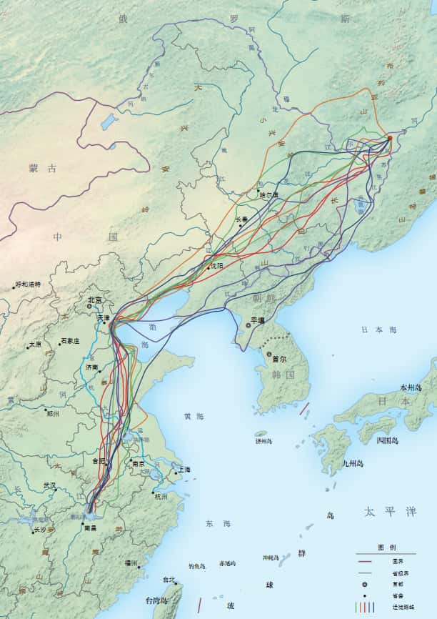东方白鹳迁徙示意图在黑龙江洪河国家级自然保护区,佩戴追踪器的东方白鹳数据显示,它们会在10月下旬开始集群迁徙。大部分东方白鹳群体主要沿着河流、湖泊、海洋沿岸迁徙,迁徙途经黑龙江-吉林-辽宁-河北-天津-山东-江苏-江西,最终到达鄱阳湖。迁徙时间一般在40-45天,到达越冬地时间在12月中旬。这些越冬的东方白鹳会在越冬地停留60天左右,也就是在次年2月上旬或中旬离开越冬地北上,基本沿着南迁路线返回繁殖地。有的个体会根据繁殖地的条件选择种群扩散。(程远制图)
