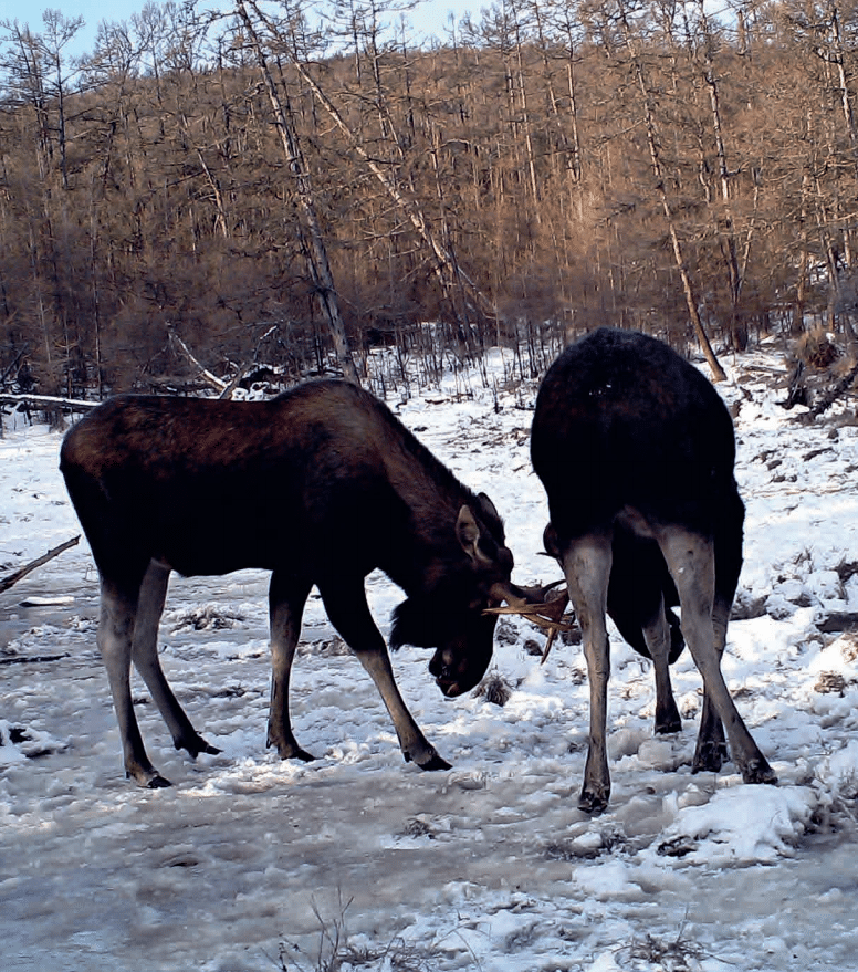 两头雄性驼鹿在顶架。驼鹿雄兽经常击角顶架,特别是在发情期。(内蒙古大兴安岭汗马国家级自然保护区供图)
