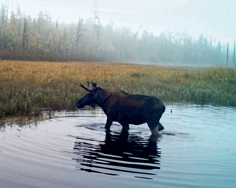 夏天,驼鹿喜欢在沼泽湿地觅食。驼鹿的角呈扁平的铲子状,而不是枝杈形。每年脱换一次。角的叉数与年龄有关,初生角为锥角,第三年分出2个叉,第五年分出4-5叉,第六年后不再有规律。仅雄性长角。(内蒙古大兴安岭汗马国家级自然保护区供图)