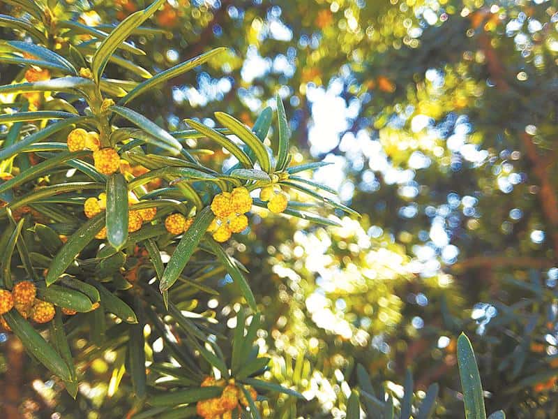 性状特征:东北红豆杉是红豆杉科红豆杉属大乔木,树高达20米;树皮红褐色,有浅裂纹;枝条茂密;叶片呈不规则的二列,斜上伸展,条形,有短柄,先端锐尖,叶面深绿色, 有光泽,叶背面有气孔;种子紫红色,有光泽,卵圆形;5—6月开花,9—10月种子成熟。