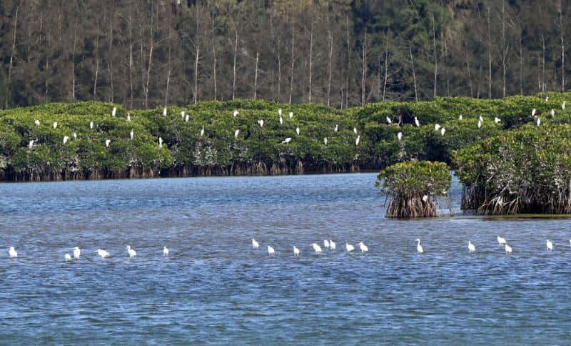 ↑鹭鸟在海南儋州市新英盐场湿地人工栽种的红树林间觅食(2022年11月8日摄)。