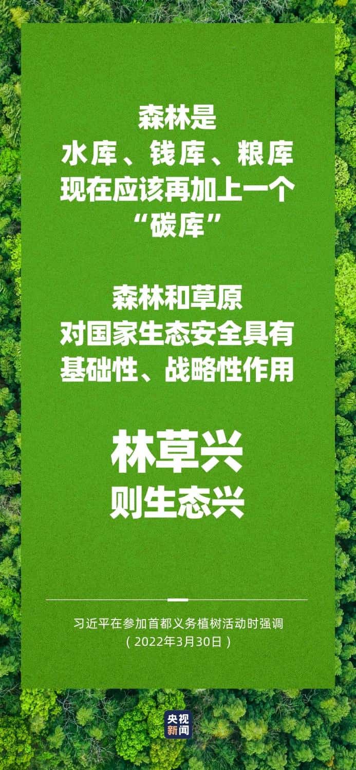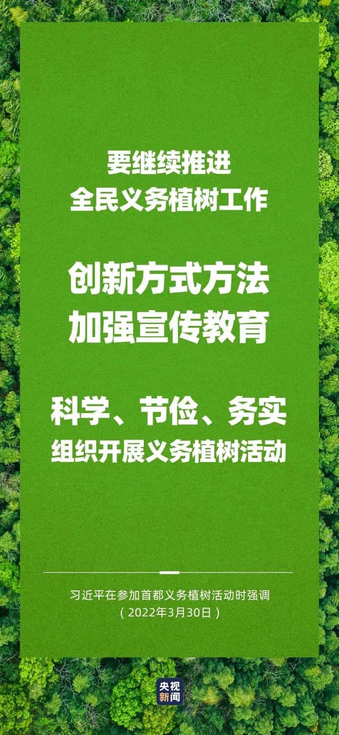 中共中央总书记、国家主席、中央军委主席习近平3月30日在参加首都义务植树活动时强调,党的十八大以来,我连续10年同大家一起参加首都义务植树,这既是想为建设美丽中国出一份力,也是要推动在全社会特别是在青少年心中播撒生态文明的种子,号召大家都做生态文明建设的实践者、推动者,持之以恒,久久为功,让我们的祖国天更蓝、山更绿、水更清、生态环境更美好。
