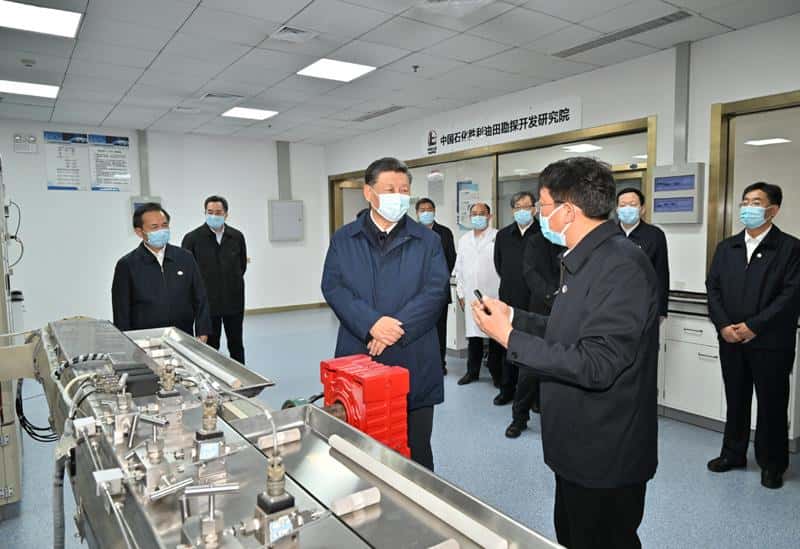 10月22日下午,中共中央总书记、国家主席、中央军委主席习近平在山东省济南市主持召开深入推动黄河流域生态保护和高质量发展座谈会并发表重要讲话。这是座谈会前,习近平21日下午在东营市胜利油田勘探开发研究院二氧化碳气驱实验室考察自主创新情况。新华社记者 李学仁 摄