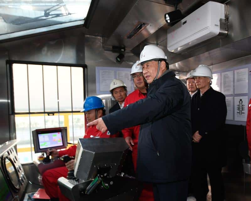10月22日下午,中共中央总书记、国家主席、中央军委主席习近平在山东省济南市主持召开深入推动黄河流域生态保护和高质量发展座谈会并发表重要讲话。这是座谈会前,习近平21日下午在位于东营市莱州湾的胜利油田莱113区块考察时,登上二层钻井平台,察看钻井自动化设备。新华社记者 李学仁 摄