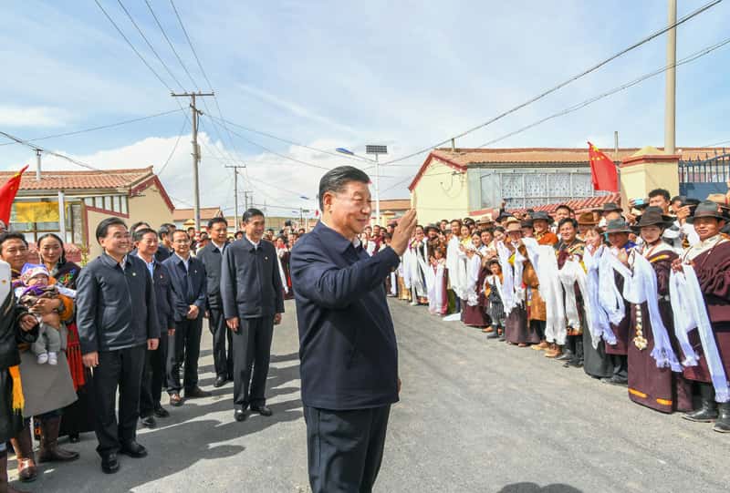 离开索南才让家,村民们看到总书记来了,热情地涌到路边,欢呼着向总书记问好。习近平动情地说,看到乡亲们过上幸福生活,我感到很欣慰。我们要继续奋斗,到新中国成立一百周年时中华民族一定能够更加坚强地屹立于世界民族之林。全面建设社会主义现代化国家,一个民族也不能少。在中华民族大家庭中,大家只有像石榴籽一样紧紧抱在一起,手足相亲、守望相助,才能实现民族复兴的伟大梦想,民族团结进步之花才能长盛不衰。习近平祝福大家“扎西德勒”。