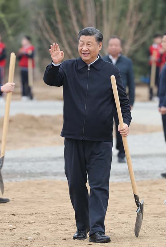4月2日,党和国家领导人习近平、李克强、栗战书、汪洋、王沪宁、赵乐际、韩正、王岐山等来到北京市朝阳区温榆河参加首都义务植树活动。这是习近平拿起铁锹走向植树地点,向正在植树的干部群众挥手致意。新华社记者 姚大伟 摄